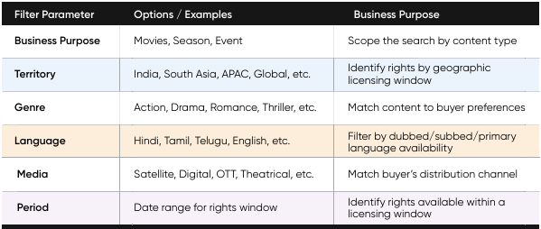 The first module, a smart, filter-driven interface, acts as the command center for rights discovery. Instead of navigating multiple systems or running manual queries, users can define their requirements across key business dimensions such as content type, territory, genre, language, media format, and licensing period. This enables highly specific, multi-dimensional queries in just a few clicks.